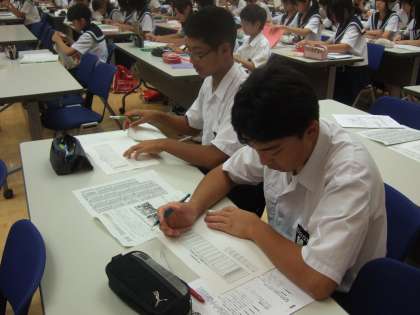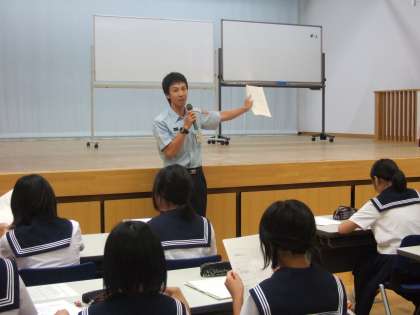 今年度のディベート大会のテーマは、「日本は救急車の利用を有料にすべきである。是か非か。」です。このテーマに対する考えを深めるために、一宮消防署から消防士長さんをお招きし、一宮市における救急車利用の現状についての講義を聞くなどしました。