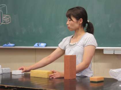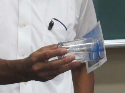 第1部では、受講者が考えたスポンジを使った圧力実験について発表し、実験の問題点等について協議しました。第2部では、大気圧を実感させる様々な実験について学びました。特に、「水を半分入れたコップにハガキでフタをして逆さまにして、手を離す実験⇒コップを横倒しにする実験」の予想やその理由については、受講者同士で白熱した議論になりました。「理科のおもしろさ」や「自然現象の不思議さ」を子どもたちに伝えていくことの重要性を実感する研修となりました。