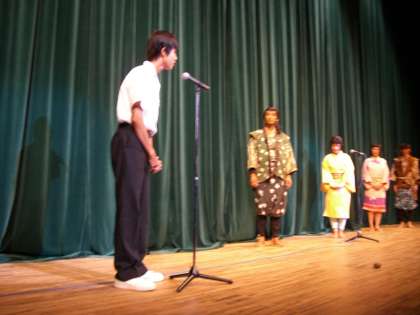 本日は、南部中学校、今伊勢中学校、大和中学校、千秋中学校の4校が「泥かぶら」を観劇しました。生徒の皆さんは真剣に劇中の登場人物の一言ひとことに耳を傾けていました。各学校の代表生徒が村の童役として劇に参加し、すばらしい演技を披露してくれました。また最後にお礼の言葉を述べる代表の生徒が「外見だけでなく心もきれいにしていくことが、生きていくうえで大切なことなのだと思った。今日の観劇会をこれからの自分の生活に生かしていきたい。」という言葉を述べました。