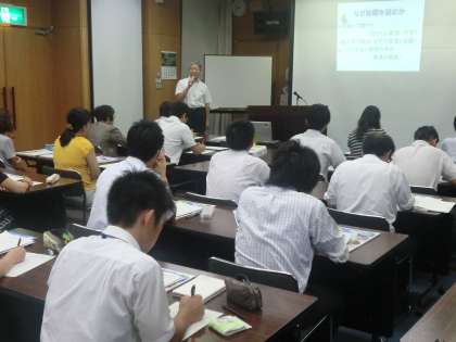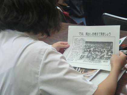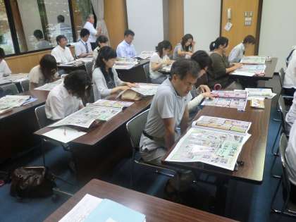 小学校「総合的菜学習の時間」の学習指導法夏期研修会では、中日新聞NIE事務局の門脇力氏を講師にお招きし、「今、なぜ新聞で」という演題で講演をしていただきました。前半では、見出しのポイントは「4C(正確・明快・簡潔・魅力」であることを学びました。また、新聞記事の見出し作りの実習に取り組みました。後半では、新聞切り抜きの優秀作品を例に、指導法について学びました。その中で、新聞の切り抜きに取り組むことで、子どもたちに様々な力(読解力・社会を見る力・漢字の力・創造力・継続力・構成力等)が身につくとういう話がありました。