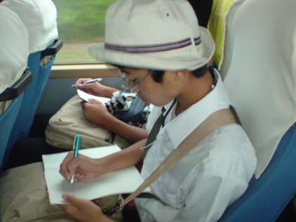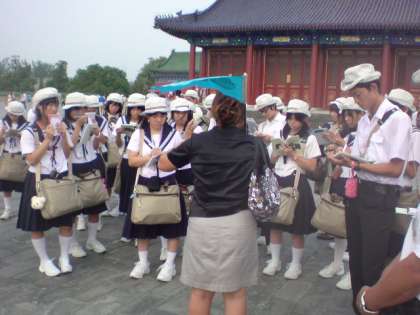 北京に到着し、天壇公園を見学しました。生徒たちは、公園の広さと建造物の大きさに圧倒されています。また、ガイドの郭さんの説明を熱心にメモをとる生徒の姿が見られました。