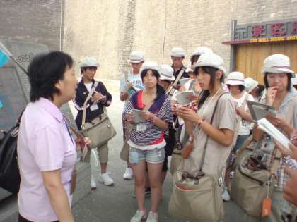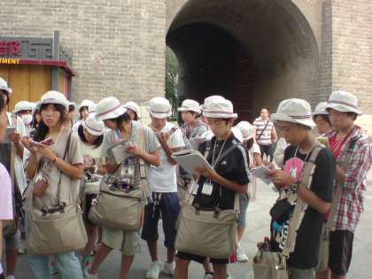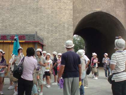 8月9日(火) 一宮市中学生海外派遣「西の城門」 公開日 2011/08/10 更新日 2011/08/10 いちのみや夢人材育成事業 城壁の高さは12m、周囲は14Kmという大きな壁が町を囲んでいました。また、西の城門は長安城の基礎を利用してレンガを積み上げて築かれていました。
