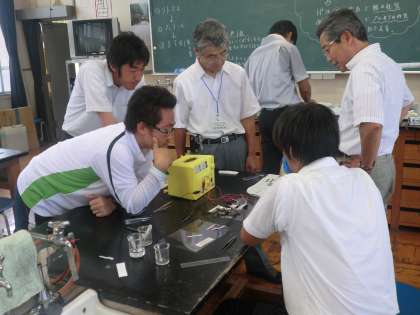 今回は、中学3年生を担当している理科の先生方を対象に講座(理科実践講座としては18回目)を開催しました。前半では、酸性・アルカリ性を示すものの正体を調べる電気泳動の予備実験を行いました。リトマス紙やBTB溶液等の様々な試薬を使って調べ、実験の問題点等について協議しました。後半では、バナナからのDNA抽出実験に挑戦しました。受講者からは「簡単にDNAを抽出することができ、生徒も興味をもつので、自校でもぜひやりたい」という意見が聞かれました。