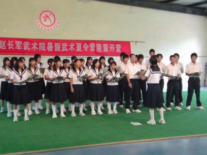 8月11日(木) 一宮市中学生海外派遣「趙長軍武術学院との交歓会1」 公開日 2011/08/11 更新日 2011/08/11 いちのみや夢人材育成事業 西安の趙長軍武術学院を訪問しました。代表生徒が中国語をおり交ぜて、挨拶を立派に行ってくれました。趙長軍武術学院は小中高一貫の学校のため小学生ぐらいの子から高校生ぐらいの子までいました。