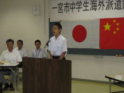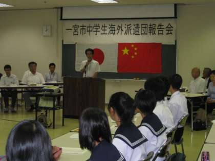 平成23年度 一宮市中学生海外派遣報告会を市長、教育長、教育委員会委員、保護者、学校関係者等の出席のもと、木曽川体育館にて開催いたしました。第1部の冒頭で、谷一夫市長から、派遣団へのねぎらいの言葉がありました。その後、派遣生徒の代表と三輪豊(一宮市立尾西第一中学校長)団長から派遣期間中の体験談や成果等の報告がありました。