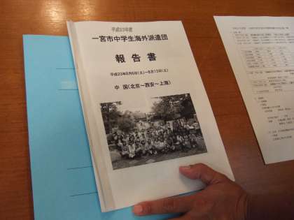 中国へ派遣された生徒や引率者の感想を交えた、8日間の日程の報告書を作成しています。その原稿の最終点検を行いました。この報告書は一宮市内の全小中学校61校に配付する予定です。派遣された生徒の原稿には、8日間の中国派遣で見て感じたことや体験して学んだことが、しっかりと表現されています。