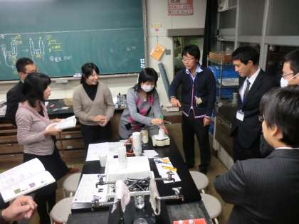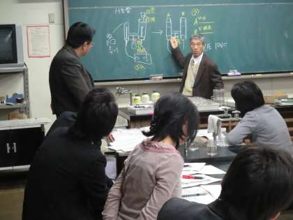 中学校2年生で理科を担当している先生方を対象に講座(理科実践講座としては34回目)を開催しました。前半は「物質から酸素を奪う化学変化」の指導法について学びました。また、教師による演示実験「テルミット反応(酸化鉄の還元)」の予備実験を行いました。受講者からは「激しく炎を上げる実験であるが、酸化鉄から鉄を容易に取り出すことができるので、生徒に見せてやりたい」という意見が聞かれました。後半は、受講者が「水の電気分解の実験」を学習した際に活用した理科ノートを持ち寄り、「ノートに記入させる内容」や「実験からまとめまでにかかった時間」等について話し合いました。講座終了後も、質量保存の法則を調べるため予備実験等を行う受講生も見られました。