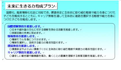 5つの柱の1つ「未来に生きる力育成プラン」で、国際化、高度情報化社会に対応でき、環境保全に主体的に取り組む態度や能力を身につけた子どもを育成するとともに、キャリア教育を通して主体的に進路を選択する態度や能力を身につけた子どもを育成しています。