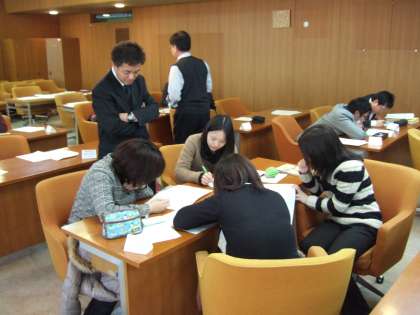 3学期最初の講座を開催しました。受講者はまず,2年図形の性質について、定義、性質など、指導するうえで基本となることを講師から学びました。後半は担当学年ごとに分かれ、3学期の指導内容について、よりよい指導方法について話し合いました。その顔つきは明日から生かそうという意気込みにあふれていました。