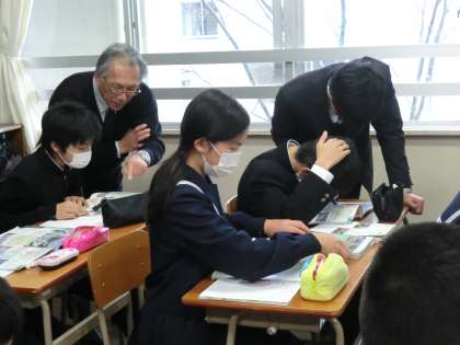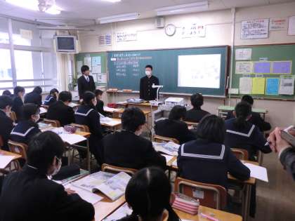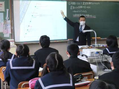 木曽川中学校で、初任者の研究授業がありました。1年生理科は、地震の揺れの大きさや震源地の距離の関係をとらえさせる授業でした。1年社会科は、首都・東京との地方との結びつきを、東京の昼と夜の人口の差からまとめました。どちらの授業もICT機器で、図を拡大して提示したり、子どもが作成したプリントを拡大して提示したりして、効果的に利用されていました。