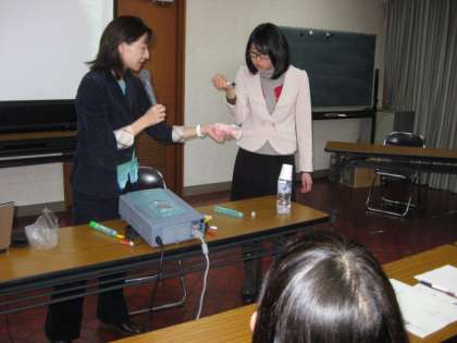 講演の途中に、アナフィラキシーショックが起きたときに使用する、エピネフリン自己注射(エピペン)をタオルに向かって実際に打ってみるということを、受講者の代表が行いました。