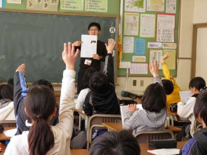 起小学校で初任者の研究授業がありました。5年生では社会の授業が行われ、ICT機器を効果的に使い、グループで子どもたちに考えさせる場面を多く取り入れた授業でした。4年生では英語活動が行われました。子どもたちは、教師が使うクラスルームイングリッシュによく反応し、元気に英語を使ったゲームを楽しんでいました。