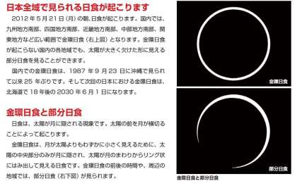 5月21日(月)の朝6:17頃から日食が起こり始めます。今回は、太陽の中央部分が月に隠されて太陽がリング状に見える「金環日食」(7:30頃)になります。日食は自然や科学への関心が高まるきっかけとなる現象です。宇宙における地球・月・太陽の位置や運動を実体験できるとても貴重な機会です。学校でも、多くの児童・生徒の皆さんで日食について学習し、ぜひ実際に観察していただきたいと思います。