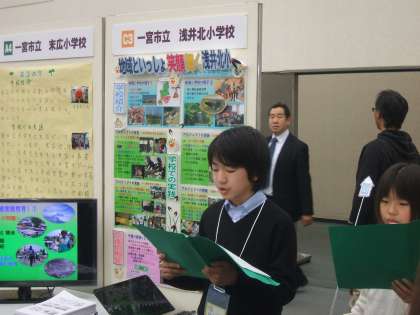 本日、名古屋国際会議場レセプションホールにて、ESDについて学び、話し合った成果を、子どもたち自らが発表する「ESD子どもフォーラム」成果発表会が行われました。午前の部では、各校のESDの取組を各校のブースで発表し、質疑応答を行う「ポスターセッション」が行われました。午後の部では、各グループによるESD成果発表会及び講演会が行われました。県内小学生から高校生までの約120人が参加し、一宮市からは小学校5校、中学校1校が参加しました。どの学校の児童生徒も、積極的に話し合いに参加し、自校の取組について分かりやすく紹介していました。