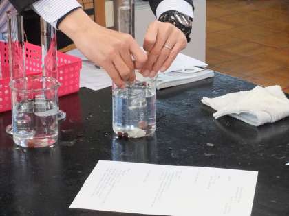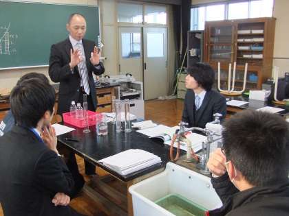 中学校1年生で理科を担当している教員を対象に講座を開催しました。前半は、iテストの正答率から生徒が理解しにくい領域と指導の仕方について話し合いました。後半は、土砂が堆積する際には粒の大きいものほど早く沈むことを視覚的に理解させるために、洗濯のりを用いて実験する方法について指導員から説明がありました。水中よりもはるかに粘性が大きいので粒の大小による速度の違いがはっきり分かりました。また、土地の隆起や沈降による堆積物の変化について、生徒に分かりやすく説明するための教具の紹介がありました。