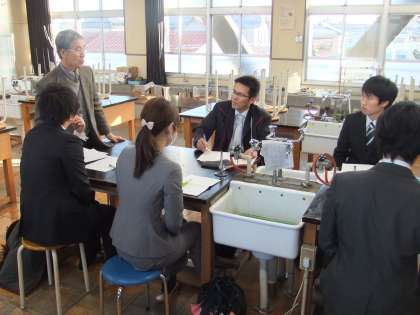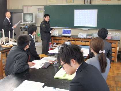 中学校1年生で理科を担当している教員を対象に講座を開催しました。前半は、受講者が今年度の実践を紹介しました。空き缶を使った大気圧実験や剣山を用いた圧力実験、音の性質を調べるために用いたパソコンソフトなど、生徒の興味を引くための一工夫が紹介されました。後半は、愛知県公立高校の入試問題の中から、1年生の学習内容の問題を取り出し、解き方や効果的な教え方について話し合いました。指導員からは、次年度につなげられるように、残りの授業で学習内容の定着を図るとよいという指導がありました。