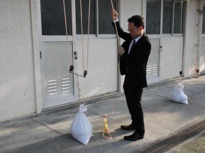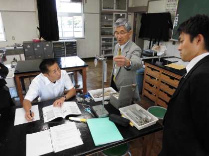 中学校3年生で理科を担当している教員を対象に講座(理科実践講座としては2回目)を開催しました。はじめに、生徒が理解しにくい動滑車の実験の注意点や指導のポイントについて話し合いました。また、速さと運動エネルギーの関係を表すグラフの取り扱いについて指導員から説明を受けました。最後に、指導員が運動場に用意した大型の滑車実験装置を使い、動滑車の場合に、引く力が少なくなることや、ひもを引っ張る距離が長くなることを、受講者が体感しました。指導員からは、導入段階で生徒が力の違いを体感することが、今後の学習に生きてくると説明がありました。