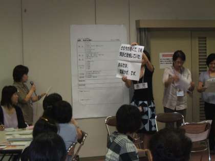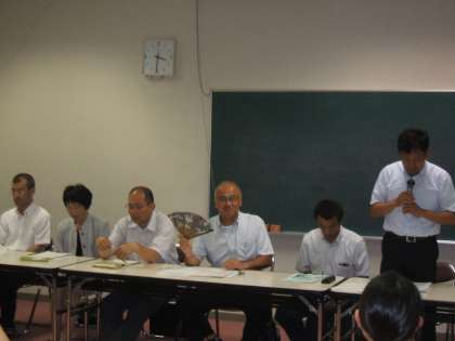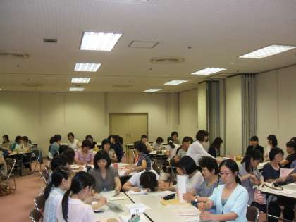 本日の会では、地区代表の養護教諭から、学校保健安全法施行規則の一部改正、熱中症による事故防止、学校のアレルギー疾患に対する取り組み、県の養護教諭研究協議会などについての伝達がありました。また、肥満予防研究推進委員会から5日に実施される肥満予防のための親子教室「にんじんクラブ」の依頼がありました。最後に、グループにわかれ、各校で実践している取組について情報交換を行いました。