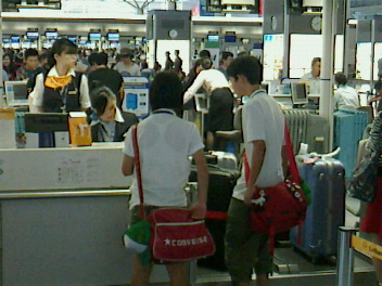 空港に到着した後、荷物の点検と出国手続きを済ませて、飛行機への搭乗を待っています。