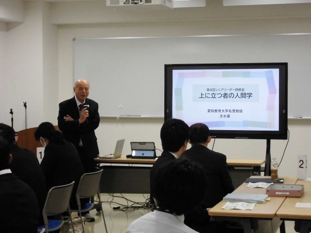 11月14日に第4回シニアリーダーシップ研修を行いました。前半は、レジリエンスを高めるために「レジリエンス・ファインダー」の活動を行い、困難を力に変える「強み」の再発見を先生方にしていただきました。愛知教育大学名誉教授の志水廣先生に「上に立つ者の人間学」をテーマに講演をしていただきました。参加者からは、「レジリエンスについての講義の中で、困難な状況に対して、どのように対応するかを話し合うことができたのが良かった。どうにもならないと感じる状況でも、自分の強みを生かして対応するしかないということ感じることができた」「自分の強みを自覚して適応することで、解決策や新しい道を見つけることができると分かった」という声が聞かれました。