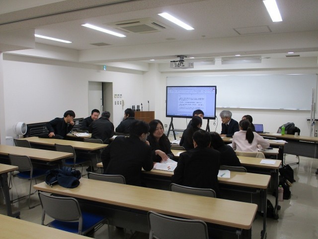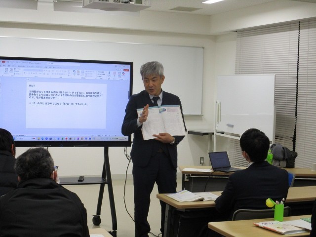 研修では、まず日頃の本文指導における悩みについてグループで情報交換を行い、改善に向けた協議を重ねました。最後に山田先生から、具体的な指導法についてのご助言をいただきました。